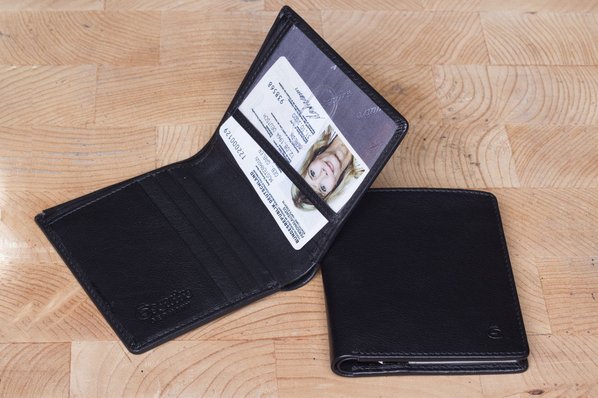 Scheintasche in schwarz mit 6 Kreditkartenfächern, Sichtfach, 2 Steckfächern, doppeltem Scheinfach und Münzfach. Maße: 10,5 x 8,5 cm